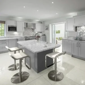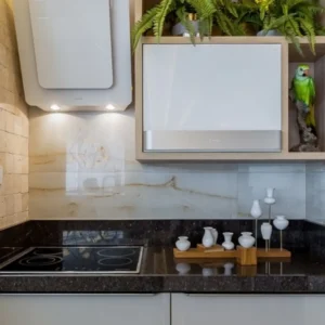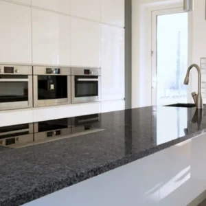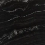 Granito indio de fondo negro y vetas con mucho movimiento en tono gris. En pulido alcanza mucho brillo, semejándose al mármol, lo que le aporta elegancia a cualquier proyecto en el que se utilice (suelos y encimeras de cocina principalmente).